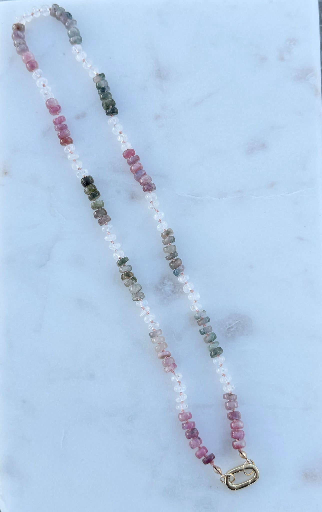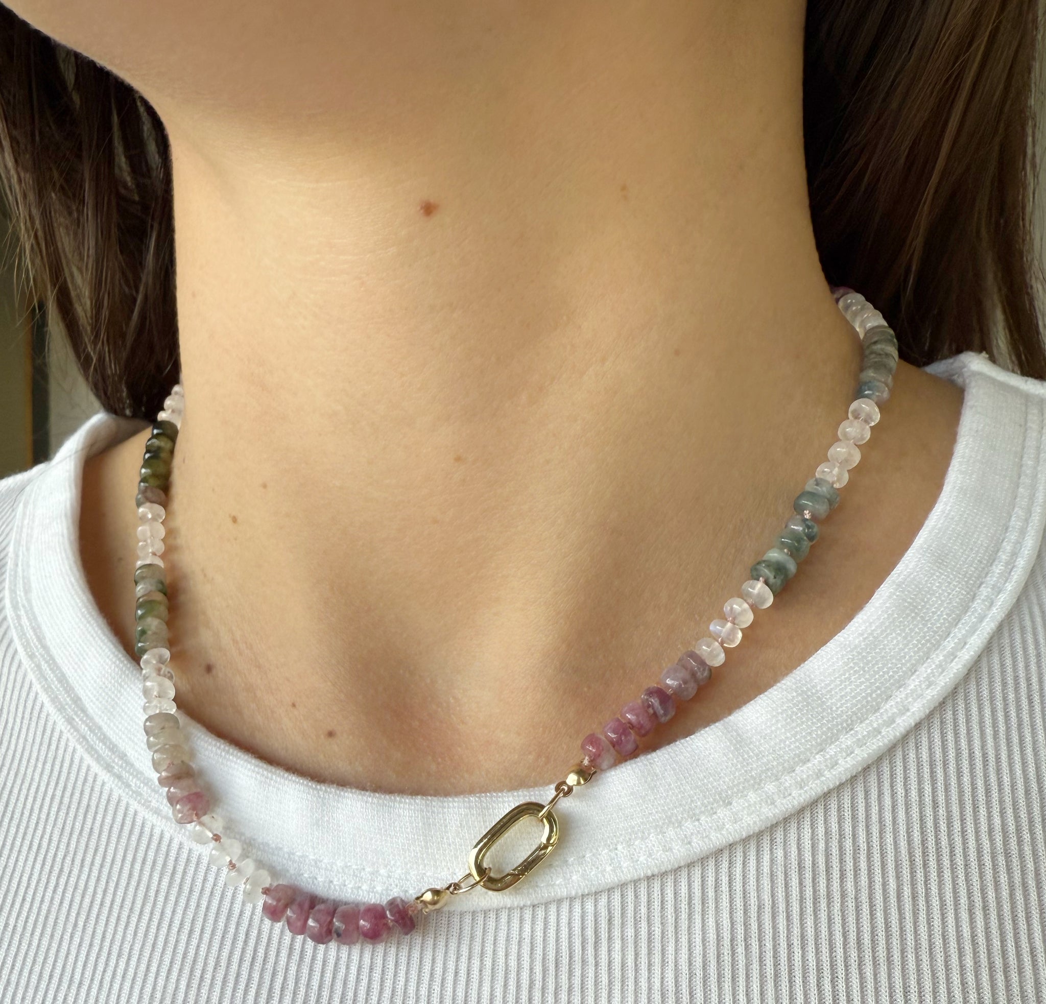 17” Rainbow Moonstone & Tourmaline Necklace Hand-Knotted with 14K Gold-Filled Hinge Clasp.